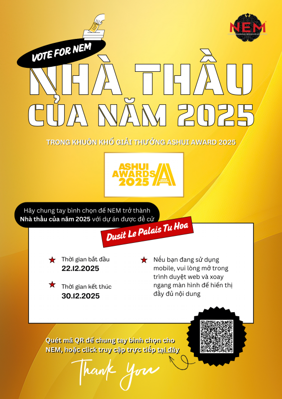 Đặc biệt, trong cùng mùa giải Ashui Award 2025, dự án Dusit Le Palais Tu Hoa Hanoi – do NEM thi công nội thất – cũng góp mặt tại bảng đề cử Nội Thất Của Năm.